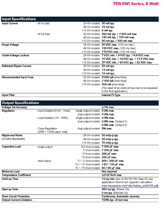 The TEN 8WI series is a family of high performance 8 Watt dc/dc converter modules featuring ultra wide 4:1 input voltage ranges in a DIP-24