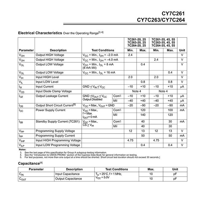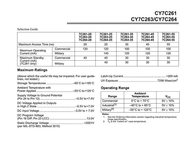 Functional Description The CY7C261, CY7C263, and CY7C264 are high-performance 8192-word by 8-bit CMOS PROMs. When deselected, the CY7C261 automatically powers down into a low-power standby mode. It is packaged in a 300-mil-wide package. The CY7C263 and CY7C264 are packaged in 300-mil-wide and 600-mil-wide packages respectively, and do not power down when deselected. The reprogrammable packages are equipped with an erasure window; when exposed to UV light, these PROMs are erased and can then be reprogrammed. The memory cells utilize proven EPROM floating-gate technology and byte-wide intelligent programming algorithms. Features ? CMOS for optimum speed/power ? Windowed for reprogrammability ? High speed — 20 ns (Commercial) — 25 ns (Military) ? Low power — 660 mW (Commercial) — 770 mW (Military) ? Super low standby power (7C261) — Less than 220 mW when deselected — Fast access: 20 ns ? EPROM technology 100% programmable ? Slim 300-mil or standard 600-mil packaging available ? 5V ± 10% VCC, commercial and military ? Capable of withstanding greater than 2001V static discharge ? TTL-compatible I/O ? Direct replacement for bipolar PROMs |