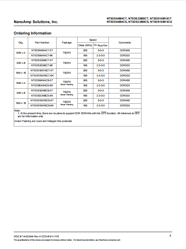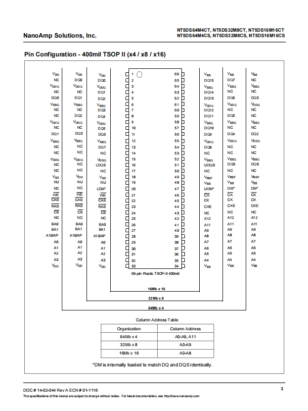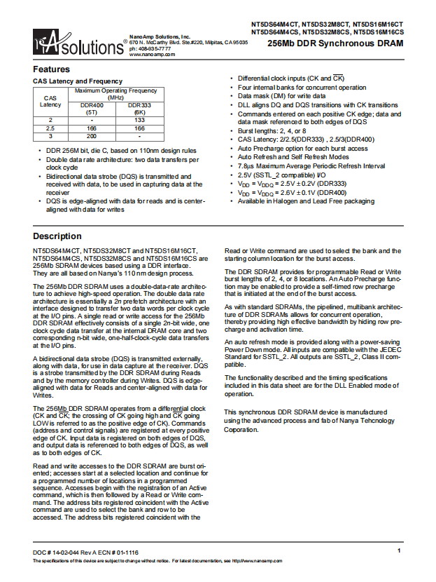NT5DS64M4CT, NT5DS32M8CT and NT5DS16M16CT, NT5DS64M4CS, NT5DS32M8CS and NT5DS16M16CS are 256Mb SDRAM devices based using a DDR interface. They are all based on Nanya’s 110 nm design process.