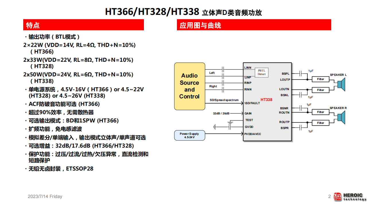 HT328 is a stereo efficient, Class-D audio amplifier for driving speakers up to 50W/4 ? in mono PBTL. It can also deliver 2×33W/8Ω power in stereo BTL.