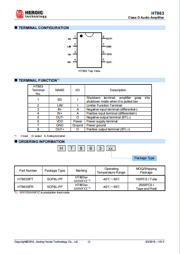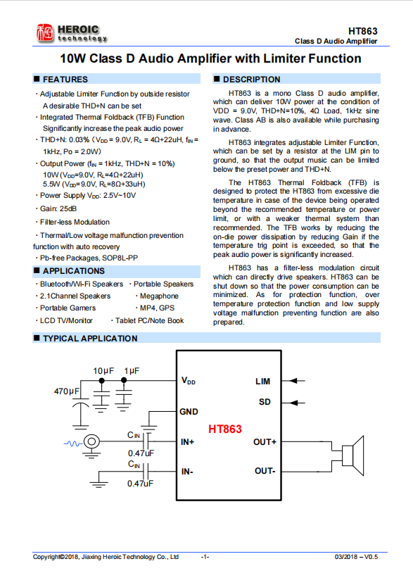 HT863 is a single channel D-class audio power amplifier that can continuously output 10W power under VDD=9.0V, THD+N=10 percent, 4 Ω load, and 1kHz signal conditions; In addition, if there are AB class requirements, they can be customized to meet.