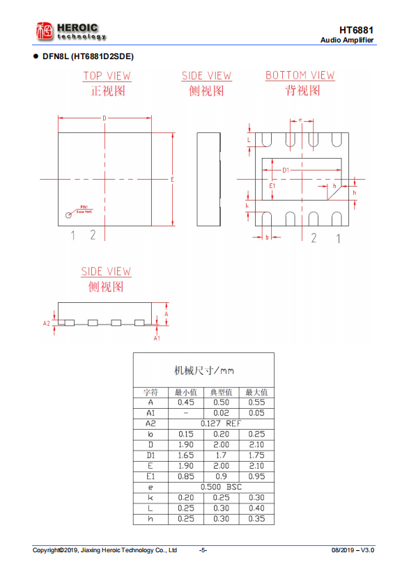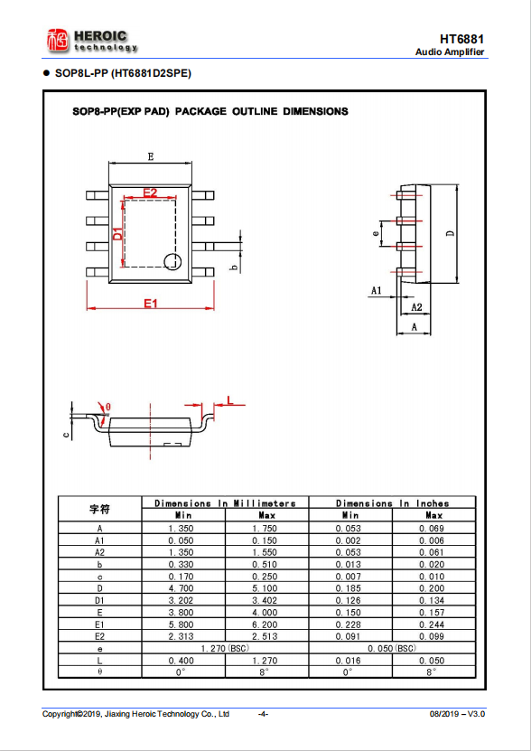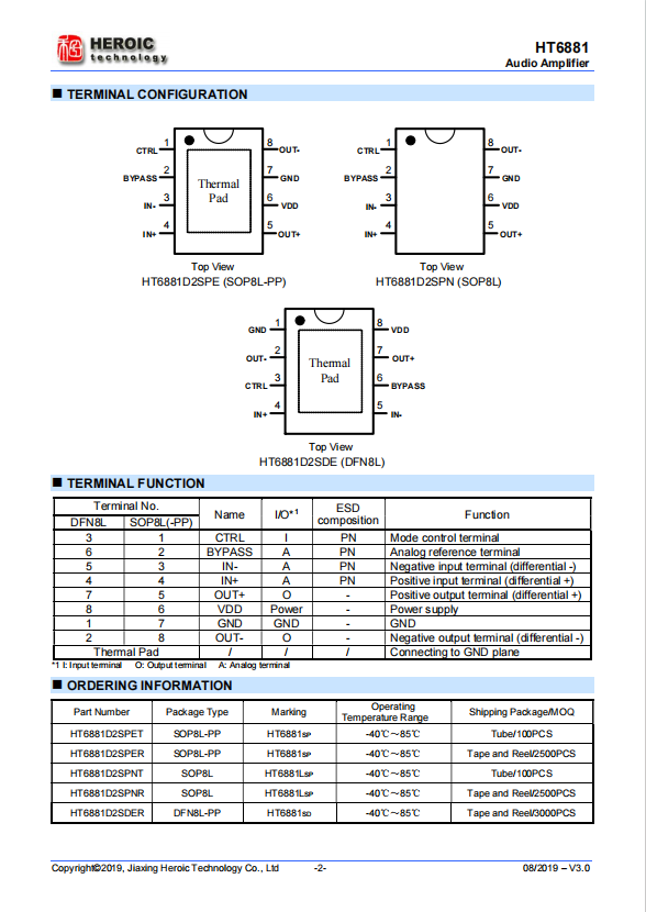 HT6881 is a Low-EMI, Anti-Clipping, filter-less mono Class D audio power amplifier IC with maximum output power of 4.7W (6.5V power supply, 4Ω load, 10 percent THD+N). It has a high efficiency with class AB amplifier performance.