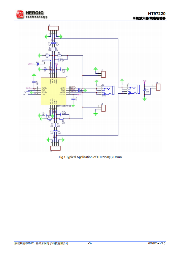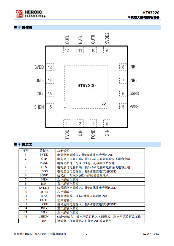 HT97220 is a differential input, direct output line driver/headphone amplifier. When powered by 5V, the device provides a 125mW driver for a 32 Ω headphone load. The IC can adjust its gain through external resistors.