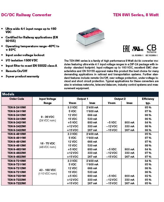 The TEN 8WI series is a family of high performance 8 Watt dc/dc converter modules featuring ultra wide 4:1 input voltage ranges in a DIP-24