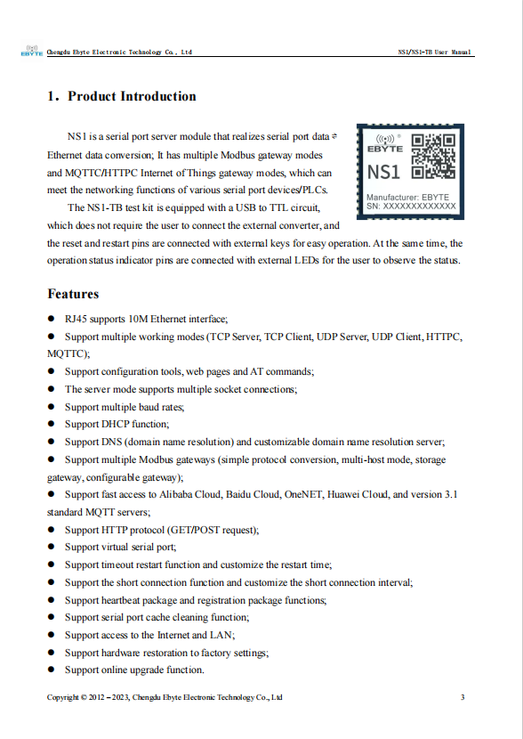 NS1 is a serial port server module that realizes serial port data ?Ethernet data conversion; It has multiple Modbus gateway modes and MQTTC/HTTPC Internet of Things gateway modes, which can meet the networking functions of various serial port