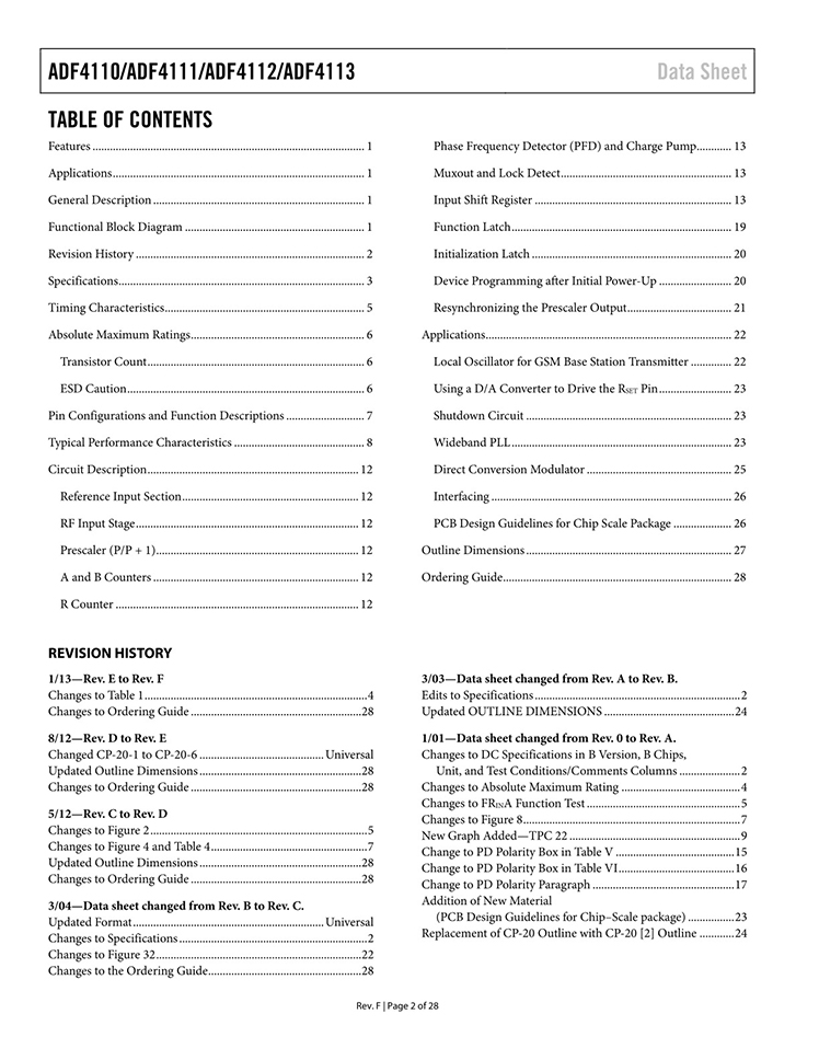GENERAL DESCRIPTION The ADF4110 family of frequency synthesizers can be used to implement local oscillators in the upconversion and downconversion sections of wireless receivers and transmitters. They consist of a low noise digital PFD (phase frequency detector), a precision charge pump, a programmable reference divider, programmable A and B counters, and a dual-modulus prescaler (P/P + 1). The A (6-bit) and B (13-bit) counters, in conjunction with the dual-modulus prescaler (P/P + 1), implement an N divider (N = BP + A). In addition, the 14-bit reference counter (R counter) allows selectable REFIN frequencies at the PFD input. A complete phase-locked loop (PLL) can be implemented if the synthesizer is used with an external loop filter and voltage controlled oscillator (VCO). FEATURES ADF4110: 550 MHz; ADF4111: 1.2 GHz; ADF4112: 3.0 GHz; ADF4113: 4.0 GHz 2.7 V to 5.5 V power supply Separate charge pump supply (VP) allows extended tuning voltage in 3 V systems Programmable dual-modulus prescaler 8/9, 16/17, 32/33, 64/65 Programmable charge pump currents Programmable antibacklash pulse width 3-wire serial interface Analog and digital lock detect Hardware and software power-down mode APPLICATIONS Base stations for wireless radio (GSM, PCS, DCS, CDMA, WCDMA) Wireless handsets (GSM, PCS, DCS, CDMA, WCDMA) Wireless LANS Communications test equipment CATV equipment |