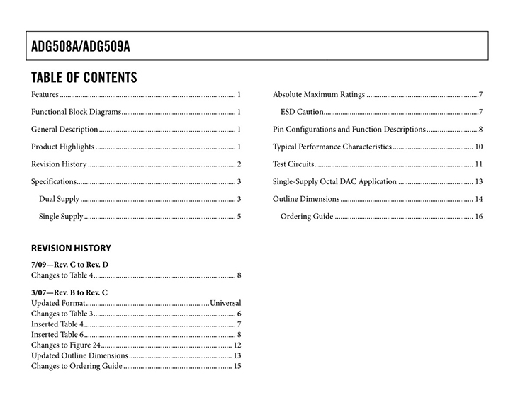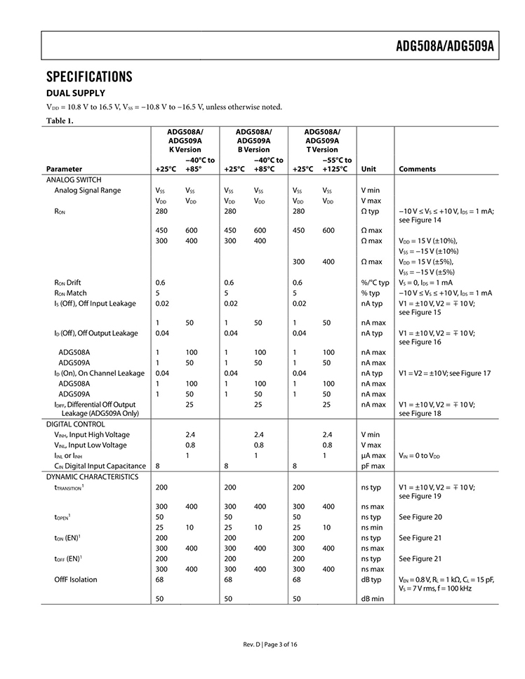 GENERAL DESCRIPTION The ADG508A and ADG509A are CMOS monolithic analog multiplexers with eight channels and dual four channels, respectively. The ADG508A switches one of eight inputs to a common output, depending on the state of three binary addresses and an enable input. The ADG509A switches one of four differential inputs to a common differential output, depending on the state of two binary addresses and an enable input. Both devices have TTL and 5 V CMOS logic-compatible digital inputs. FEATURES 44 V supply maximum rating VSSto VDDanalog signal range Single-/dual-supply specifications Wide supply range: 10.8 V to 16.5 V Extended plastic temperature range: ?40°C to +85°C Low power dissipation: 28 mW maximum Low leakage: 20 pA typical Available in 16-lead DIP/SOIC and 20-lead PLCC/LCC packages Superior alternative to DG508A, HI-508 DG509A, HI-509 |
