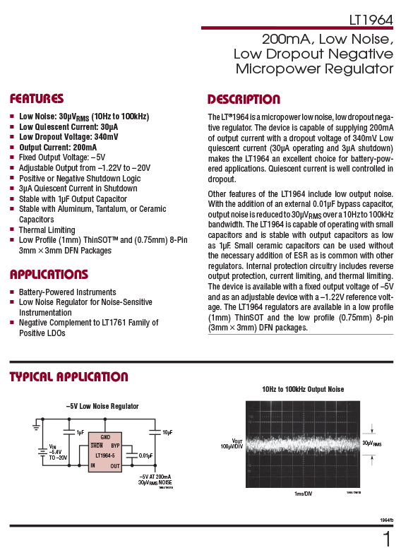 DESCRIPTION The LT?1964 is a micropower low noise, low dropout negative regulator. The device is capable of supplying 200mA of output current with a dropout voltage of 340mV. Low quiescent current (30μA operating and 3μA shut down) makes the LT1964 an excellent choice for battery powered applications. Quiescent current is well controlled in dropout. FEATURES ■ Low Profile (1mm) ThinSOTTM Package ■ Low Noise: 30μVRMS (10Hz to 100kHz) ■ Low Quiescent Current: 30μA ■ Low Dropout Voltage: 340mV ■ Output Current: 200mA ■ Fixed Output Voltage: –5V ■ Adjustable Output from –1.22V to –20V ■ Positive or Negative Shutdown Logic ■ 3μA Quiescent Current in Shutdown ■ Stable with 1μF Output Capacitor ■ Stable with Aluminum, Tantalum, or Ceramic Capacitors ■ Thermal Limiting APPLICATIONS ■ Battery-Powered Instruments ■ Low Noise Regulator for Noise-Sensitive Instrumentation ■ Negative Complement to LT1761 Family of Positive LDOs |
