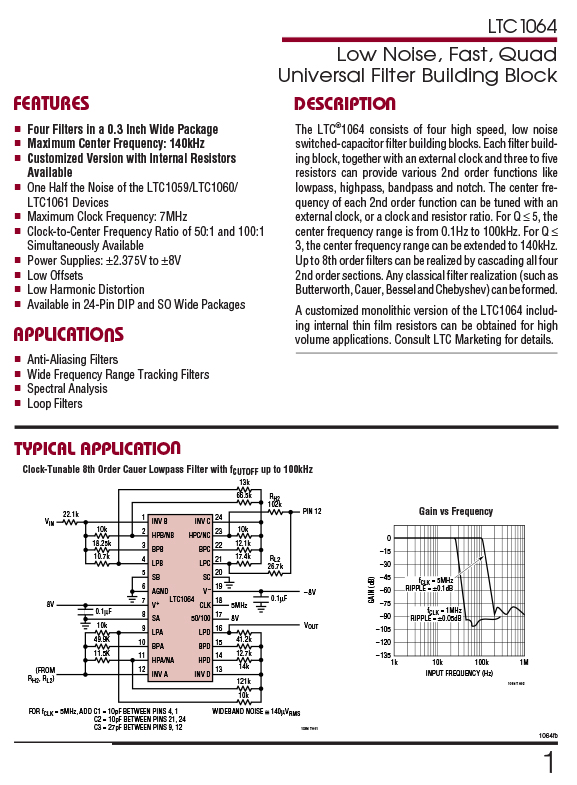 DESCRIPTION The LTC?1064 consists of four high speed, low noise switched-capacitor filter building blocks. Each filter building block, together with an external clock and three to five resistors can provide various 2nd order functions like lowpass, highpass, bandpass and notch. The center frequency of each 2nd order function can be tuned with an external clock, or a clock and resistor ratio. For Q ≤ 5, the center frequency range is from 0.1Hz to 100kHz. For Q ≤ 3, the center frequency range can be extended to 140kHz. Up to 8th order filters can be realized by cascading all four 2nd order sections. Any classical filter realization (such as Butterworth, Cauer, Bessel and Chebyshev) can be formed. FEATURES ■ Four Filters in a 0.3-Inch Wide Package ■ One Half the Noise of the LTC1059/LTC1060/ LTC1061 Devices ■ Maximum Center Frequency: 140kHz ■ Maximum Clock Frequency: 7MHz ■ Clock-to-Center Frequency Ratio of 50:1 and 100:1 Simultaneously Available ■ Power Supplies: ±2.375V to ±8V ■ Low Offsets ■ Low Harmonic Distortion ■ Customized Version with Internal Resistors Available APPLICATIONS ■ Anti-Aliasing Filters ■ Wide Frequency Range Tracking Filters ■ Spectral Analysis ■ Loop Filters |