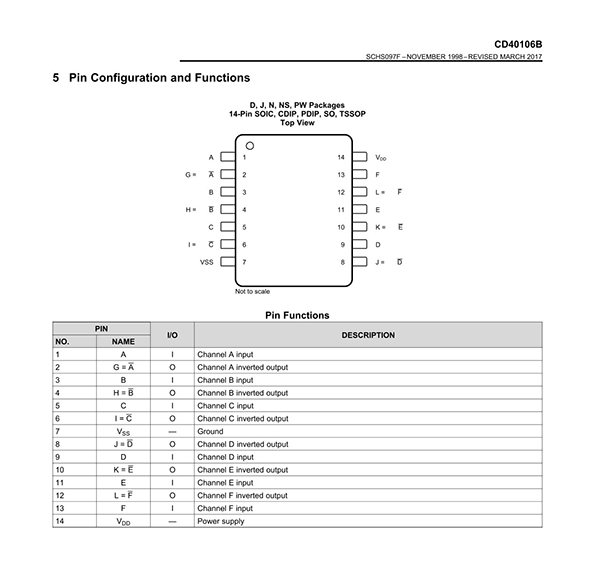 General Description The CD40106BC Hex Schmitt Trigger is a monolithic complementary MOS (CMOS) integrated circuit constructed with N and P-channel enhancement transistors. Features ■Wide supply voltage range: 3V to 15V ■High noise immunity: 0.7 VDD(typ.) ■Low power TTL compatibility: Fan out of 2 driving 74L or 1 driving 74LS ■Hysteresis: 0.4 VDD(typ.), 0.2 VDD guaranteed ■Equivalent to MM74C14 ■Equivalent to MC14584B |