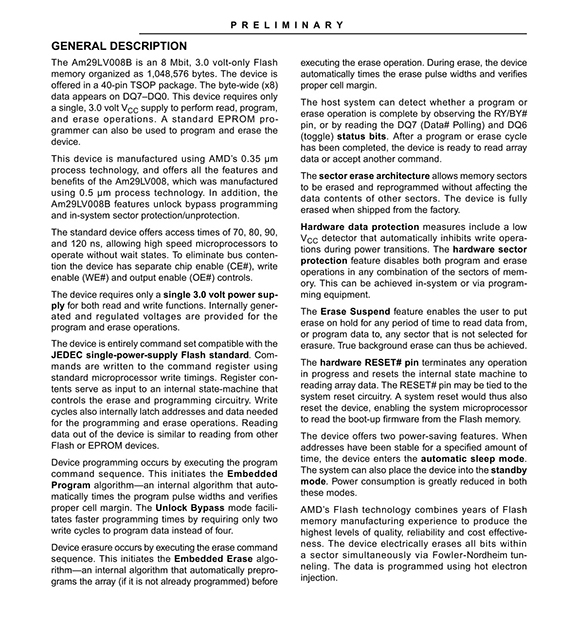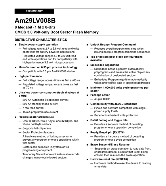 GENERAL DESCRIPTION The Am29LV008B is an 8 Mbit, 3.0 volt-only Flash memory organized as 1,048,576 bytes. The device is offered in a 40-pin TSOP package. The byte-wide (x8) data appears on DQ7–DQ0. This device requires only a single, 3.0 volt VCC supply to perform read, program, and erase operations. A standard EPROM programmer can also be used to program and erase the device. DISTINCTIVE CHARACTERISTICS ■ Single power supply operation — Full voltage range: 2.7 to 3.6 volt read and write operations for battery-powered applications — Regulated voltage range: 3.0 to 3.6 volt read and write operations and for compatibility with high performance 3.3 volt microprocessors ■ Manufactured on 0.32 μm process technology — Compatible with 0.5 μm Am29LV008 device ■ High performance — Full voltage range: access times as fast as 90 ns — Regulated voltage range: access times as fast as 70 ns ■ Ultra low power consumption (typical values at 5 MHz) — 200 nA Automatic Sleep mode current — 200 nA standby mode current — 7 mA read current — 15 mA program/erase current ■ Flexible sector architecture — One 16 Kbyte, two 8 Kbyte, one 32 Kbyte, and fifteen 64 Kbyte sectors — Supports full chip erase — Sector Protection features: A hardware method of locking a sector to prevent any program or erase operations within that sector Sectors can be locked in-system or via programming equipment Temporary Sector Unprotect feature allows code changes in previously locked sectors ■ Unlock Bypass Program Command — Reduces overall programming time when issuing multiple program command sequences ■ Top or bottom boot block configurations available ■ Embedded Algorithms — Embedded Erase algorithm automatically preprograms and erases the entire chip or any combination of designated sectors — Embedded Program algorithm automatically writes and verifies data at specified addresses ■ Minimum 1,000,000 write cycle guarantee per sector ■ 20-year data retention at 125°C — Reliable operation for the life of the system ■ Package option — 40-pin TSOP ■ Compatibility with JEDEC standards — Pinout and software compatible with singlepower supply Flash — Superior inadvertent write protection ■ Data# Polling and toggle bits — Provides a software method of detecting program or erase operation completion ■ Ready/Busy# pin (RY/BY#) — Provides a hardware method of detecting program or erase cycle completion ■ Erase Suspend/Erase Resume — Suspends an erase operation to read data from, or program data to, a sector that is not being erased, then resumes the erase operation ■ Hardware reset pin (RESET#) — Hardware method to reset the device to reading array data |